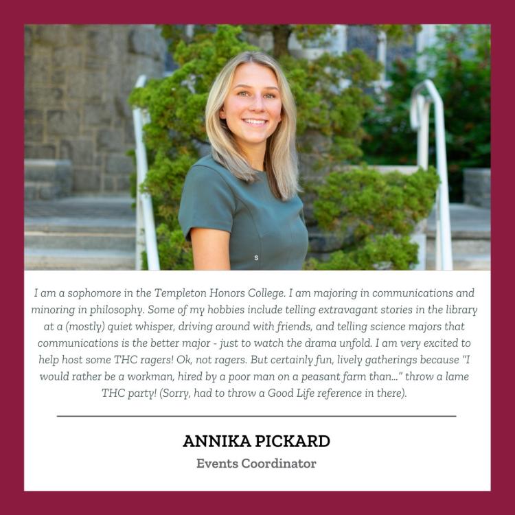 Annika (“Anni”) Pickard is the Templeton Honors College Communications Intern and was instrumental to the success of the 25th Anniversary Gala. Read on to learn about Anni, as well as the thought and care that brought the 25th Anniversary Gala to life.